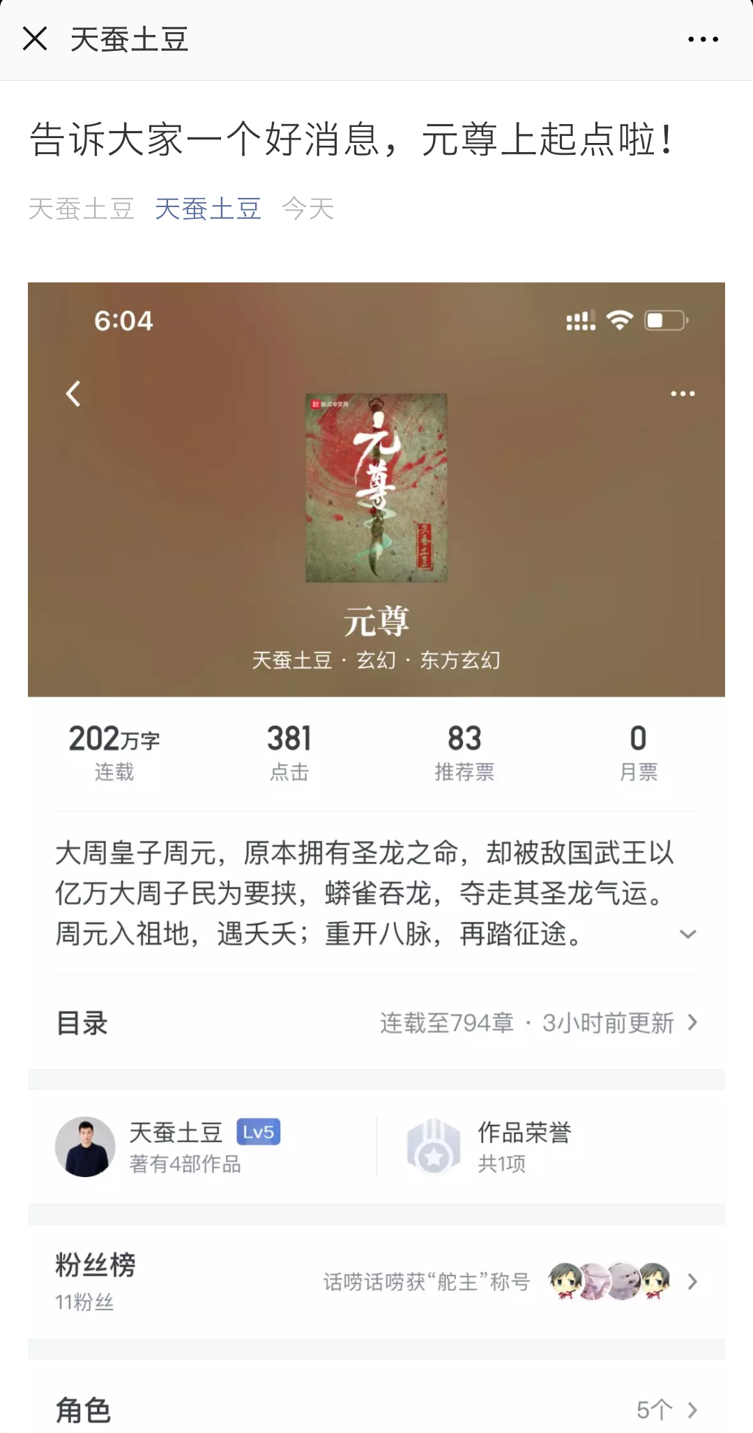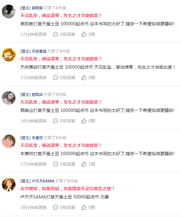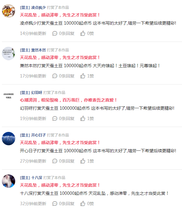 天蚕土豆在自己的公众号上发布了这个消息,一时便引起了读者的轰动,在起点上,立马就有人开启了打赏飘红模式。这个消息一时就在圈子里传开了,《元尊》的书评区也是满屏的飘红打赏贴。