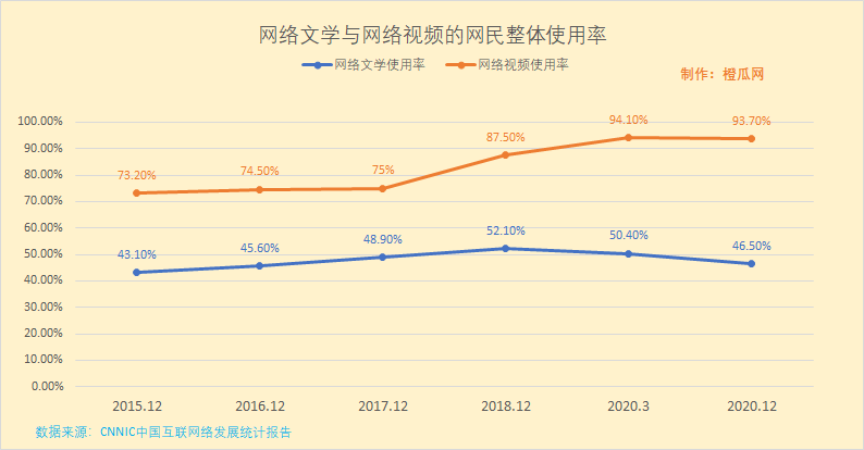 近几年,网络文学面临着网络视频尤其是短视频的强烈竞争,有理由认为有相当一部分潜在的网络文学用户被抖音、快手等短视频分流。据CNNIC中国互联网络发展状况统计报告显示,2018年12月,整体网民的网络文学使用率是52.1%,到2020年网络文学的使用率下降到46.5%,而网络视频的使用率从2018年的87.5%,上升到了2020年12月的93.7%。在用户渗透率以及占用网民的主要休闲时间上,网络视频比网络文学优势明显。
