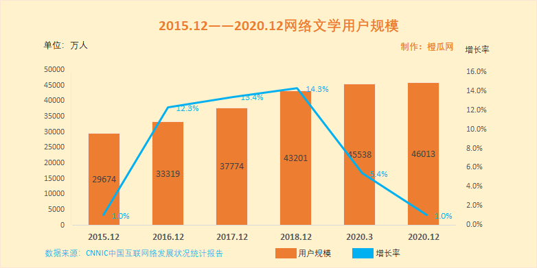 在2018年前的几年,网络文学用户规模一直保持着较高的增长水平,此后增速便有所放缓。2018年12月中国网络文学用户规模达到43201万,同比增长14.3%,2020年3月用户规模为45538万,增长率为5.4%,到2020年12月用户规模46013万,增长率只有1%。虽然增速不复以前,但网络文学用户依然在保持着持续增长,网络文学依然是几亿人的喜好。