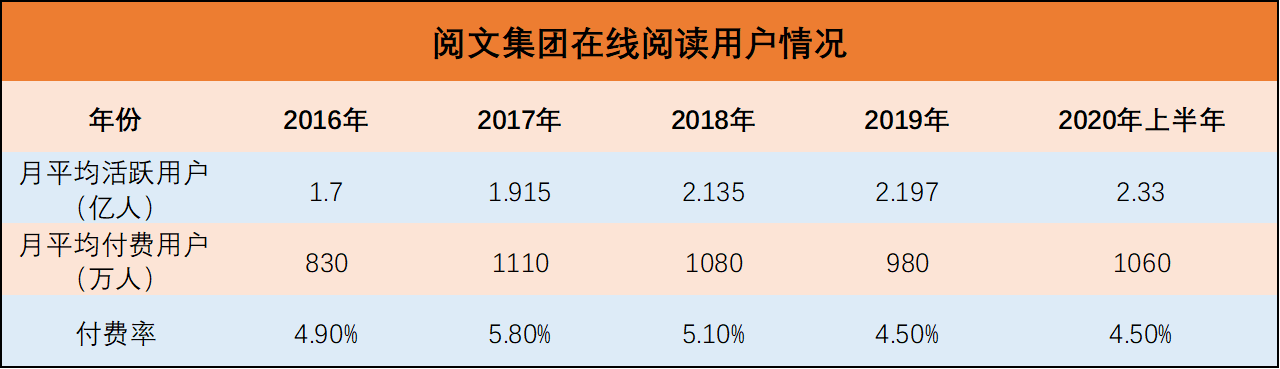 据阅文集团财报显示,阅文集团2017年平均每月付费用户1110万,2018年度这个数据是1080万人,2019年是980万人,连续三年下滑。平均月活用户规模在增长,付费用户却在连续减少,两相对比,在线阅读的用户付费率下滑得尤为明显。但在2020年,阅文集团年中财报显示,月付费用户由同期970万增长至1060万,其表现有所回升,付费率也保持在了4.5%。