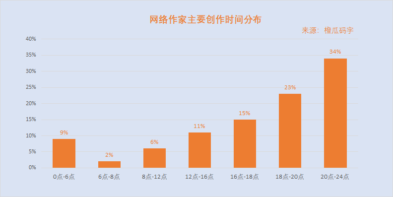 网络小说创作在外界看来似乎就是每天几千到上万字的更新,这背后却是作家们长期持续的付出,是日复一日的熬夜。根据橙瓜码字的统计,在作者主要创作时间分布上来看,下午到晚上是网络作家们创作的活跃时间,超过34%的作者主要码字时间是20点到24点。令人感叹的是有高达9%比例的作者主要码字时间是在0点到凌晨6点。抛开主观感觉,从数据上来看,网络小说创作,也是一个非常辛苦的职业。