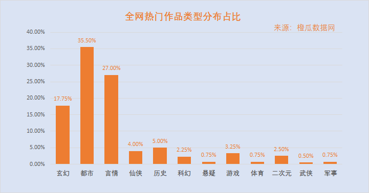 通过橙瓜数据网统计,综合全网各大渠道平台,过去一年,全网热门作品主要集中分布在都市、言情、玄幻这三大类型,其次是历史和仙侠类型,再之后是游戏、二次元与科幻类型作品。