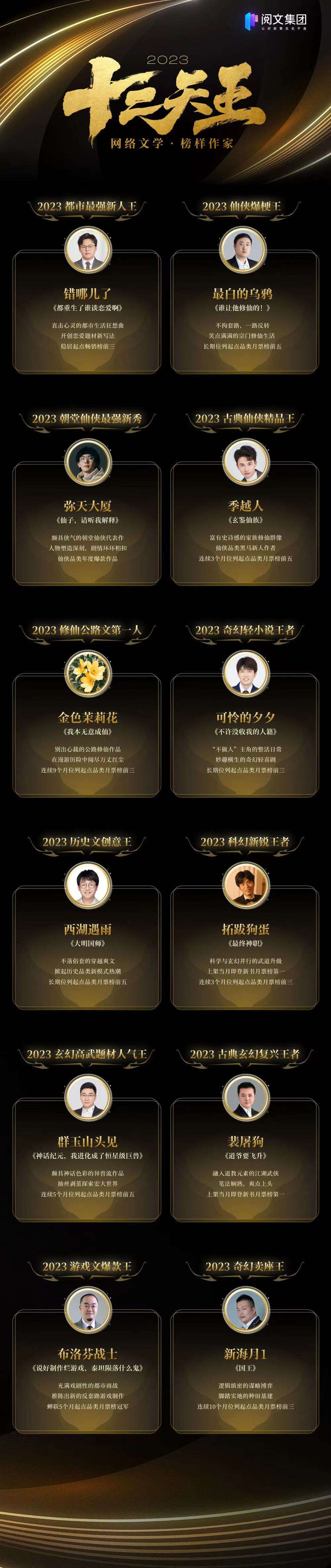 1月10日,阅文集团发布了新一年网络文学榜样作家“十二天王”的榜单。错哪儿了、金色茉莉花、季越人、可怜的夕夕、弥天大厦、西湖遇雨、最白的乌鸦等十二位新锐作家跻身“十二天王”。榜单上的作家及其作品集结了仙侠、都市、历史、奇幻、玄幻、轻小说、游戏等多个题材,或为网络文学的繁荣创作开启了全新篇章,而这12位作家,属于他们的时代,或许这才刚刚开始。