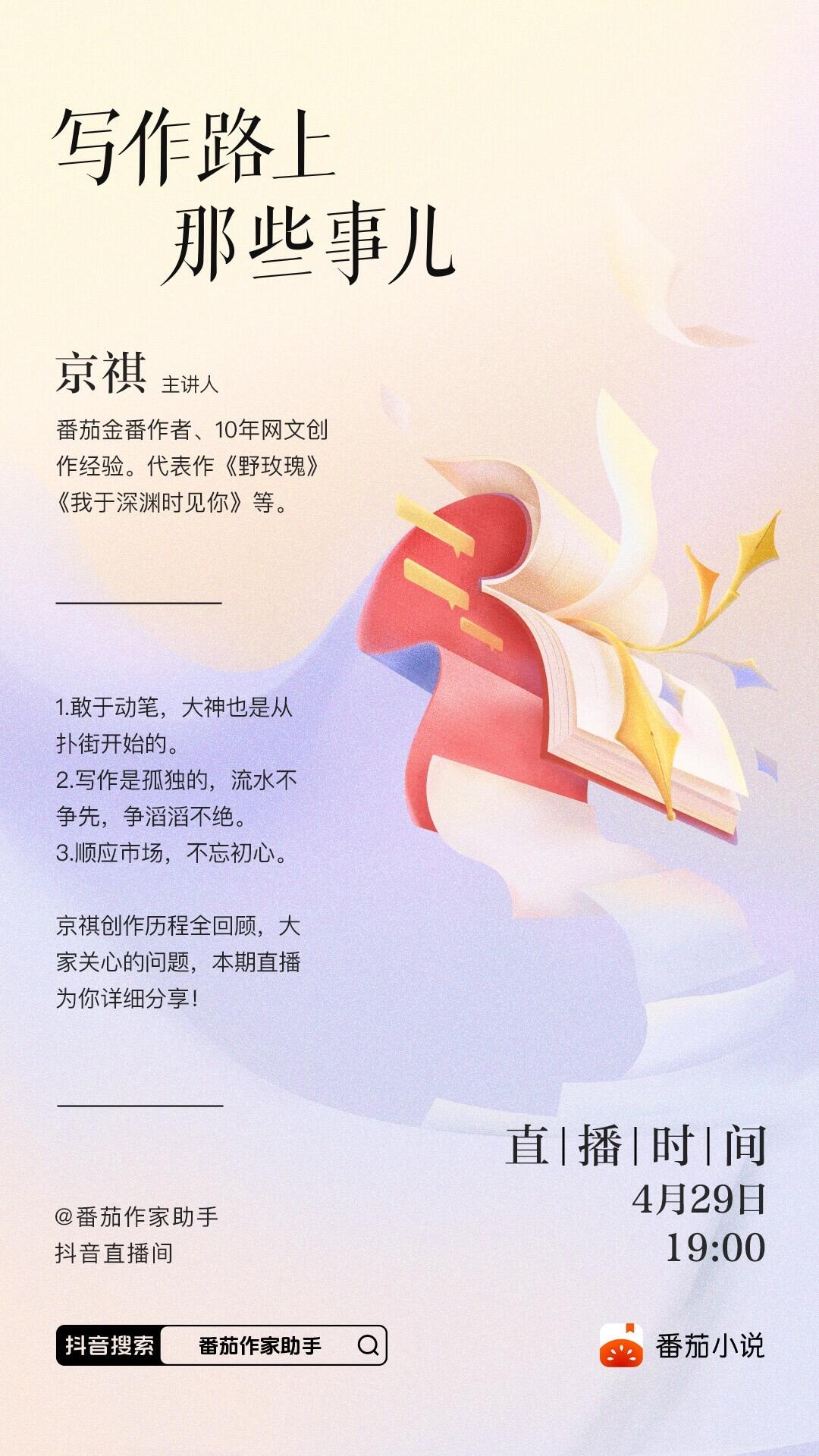金番作家京祺直播开课啦!揭秘创作经验、传授心态调整秘籍,教你突破写作瓶颈。直播间还有年卡、月卡及手办多重福利!点击预约,速来直播间互动!