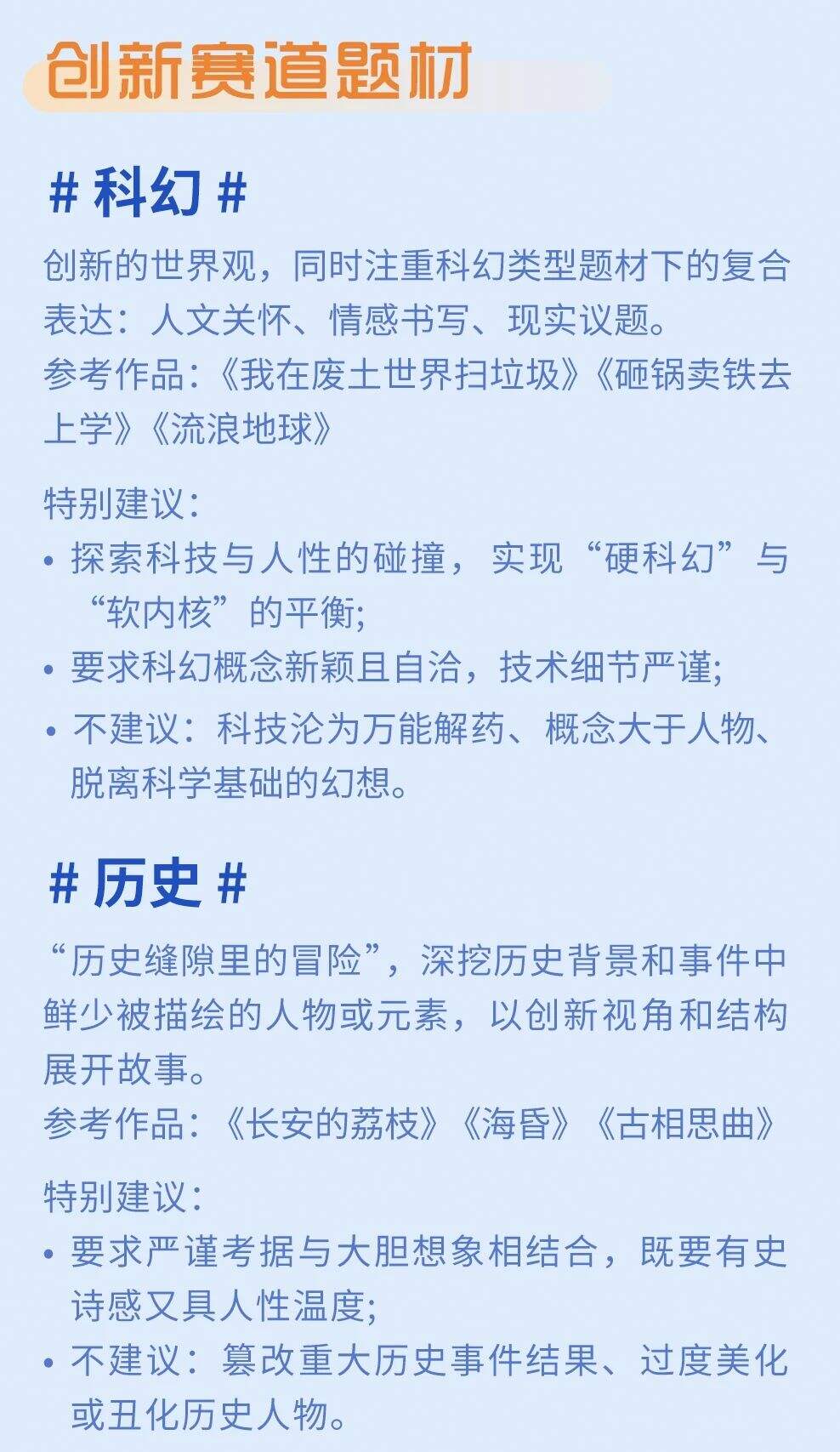 本次征文大赛将持续一年,围绕“都市情感”“现实主义”“悬疑冒险”“创新赛道”四大方向展开,鼓励创作者在真实语境与丰富想象之间寻找突破口。其中,都市情感类作品侧重叙事的敏锐视角与情绪张力,在现实写照中融入浪漫表达;现实主义题材聚焦时代议题下的个体命运,展现贴近生活的温情故事与多元视角的女性成长;悬疑冒险类作品强调在冒险与博弈中呈现地域风貌与真实人性;创新赛道的科幻与历史题材则更突出复合表达、新颖叙事,鼓励创作者基于真实基础展开深度书写。