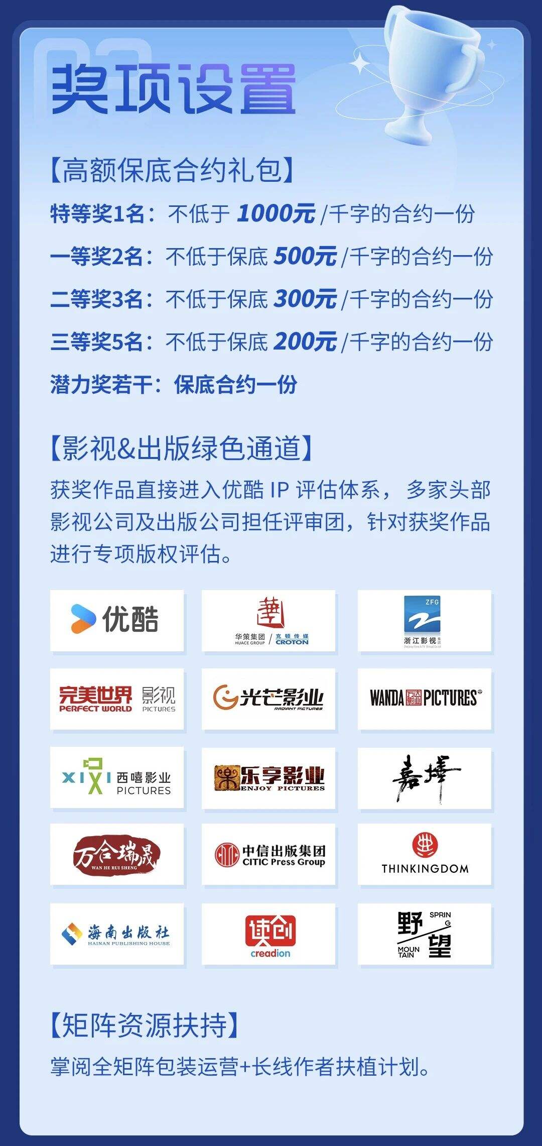 作为联合发起方,优酷将在活动中充分发挥影视资源优势,所有获奖作品将直接进入优酷IP评估体系,优先获得影视化开发机会。同时,掌阅也将提供内容扶持计划,结合自身平台分发能力、矩阵流量支持与作者孵化机制,为优质内容提供持续赋能。
