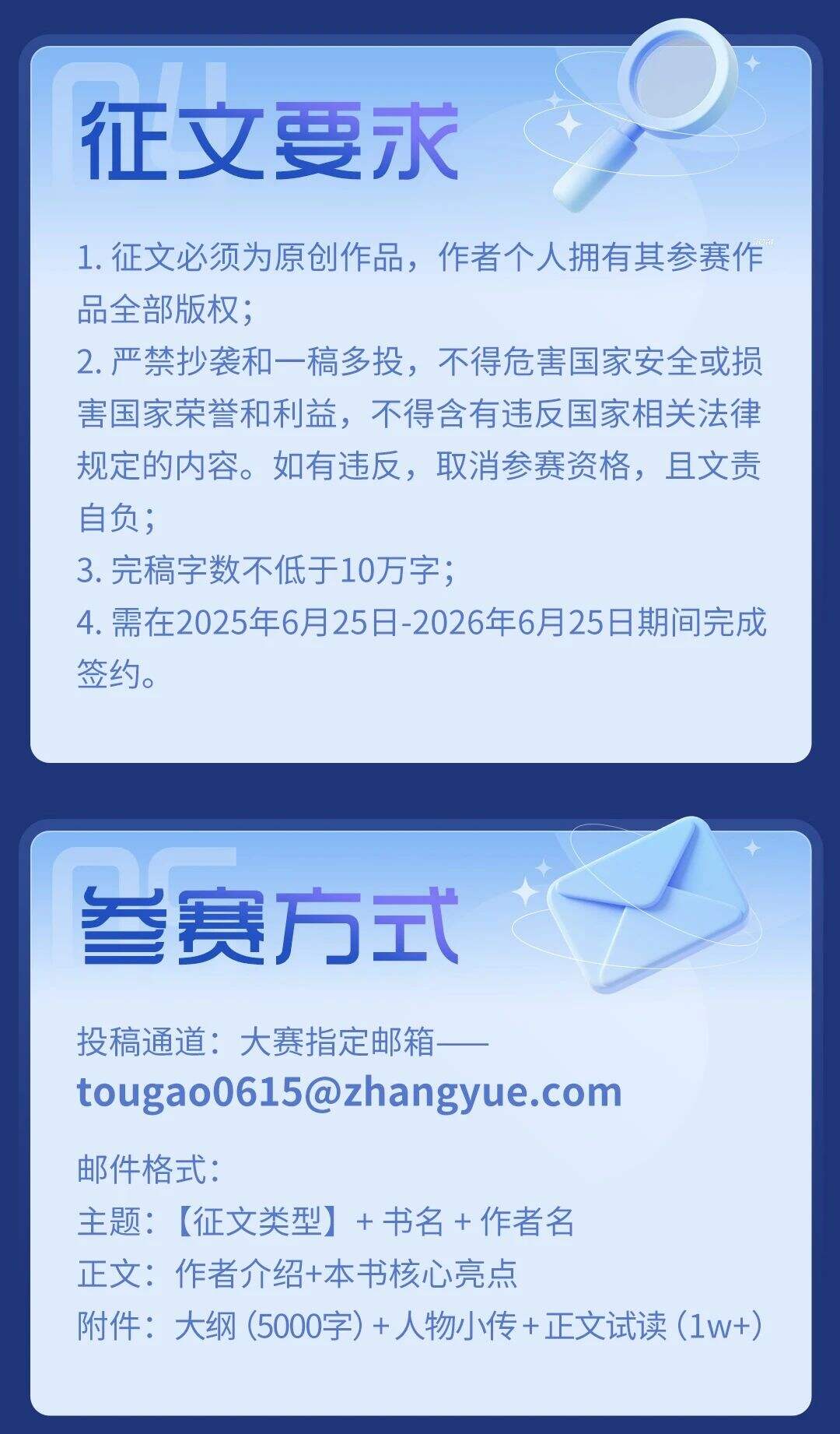 活动面向全网用户开放,投稿通道为专用邮箱tougao0615@zhangyue.com。首轮入围名单将于2026年1月25日公布,最终结果计划于2026年6月25日揭晓,颁奖典礼预计于2026年7月举行。
