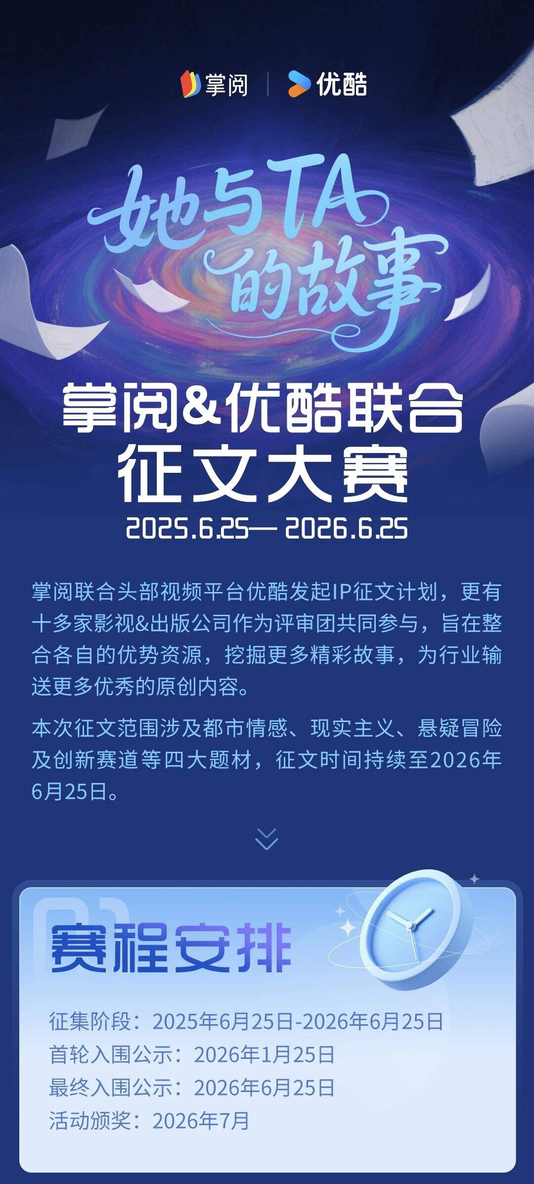 夏日如约至,故事正当时。6月25日,掌阅科技携手优酷联合发起“她与TA的故事”征文大赛,面向全网用户征集优质原创故事。此次活动汇聚了来自影视与出版领域的多家头部公司,共同构建内容评审与孵化机制,旨在以读写结合、文影联动的方式,为现实题材与创新表达打开全新通道,发掘更多精彩故事与潜力创作者。