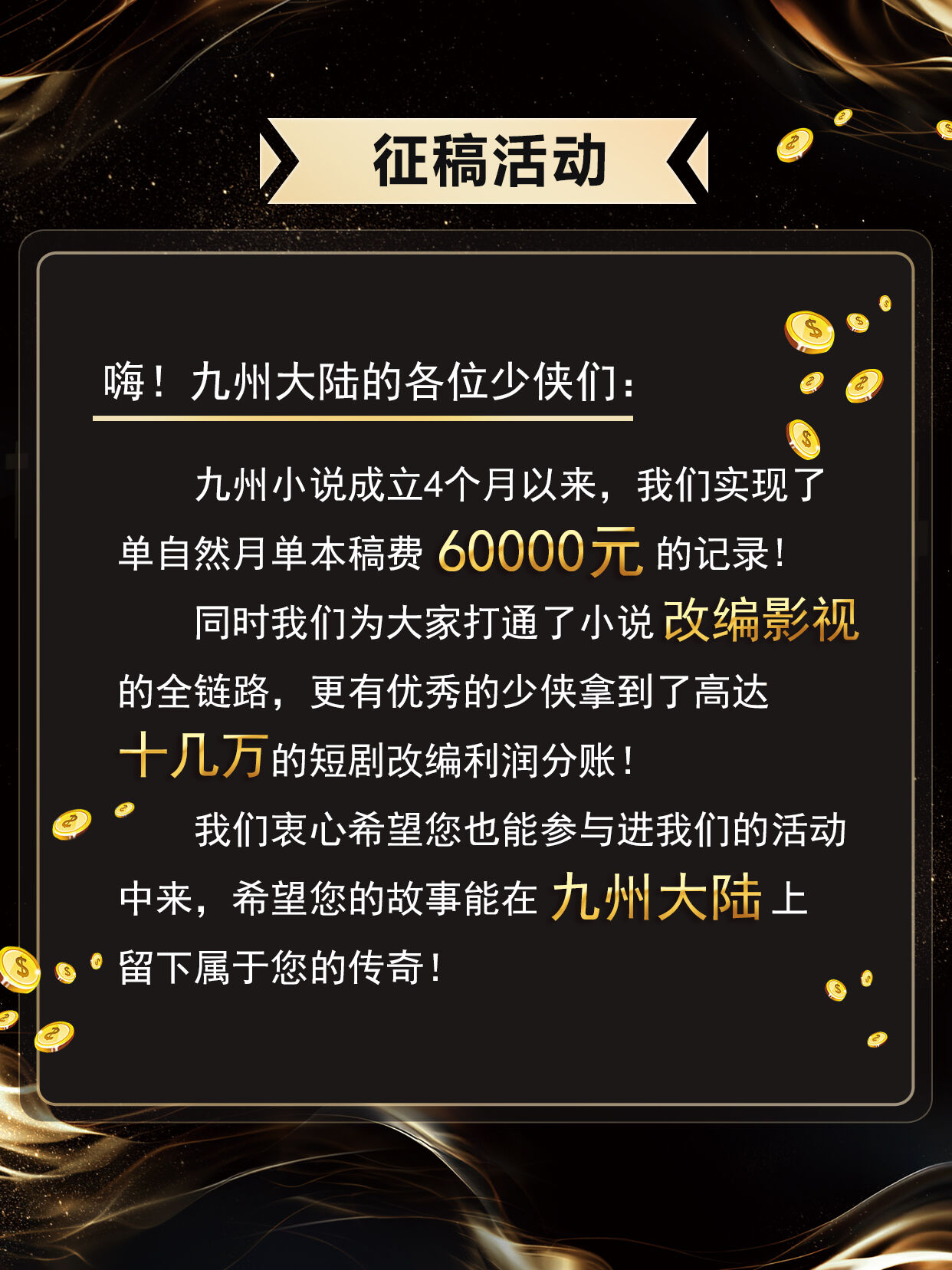 九州小说成立4个月以来,我们实现了单自然月单本稿费60000的记录,同时我们为大家打通了小说改编影视的全链路,更有优秀的少侠拿到了高达十几万的短剧改编利润分账!