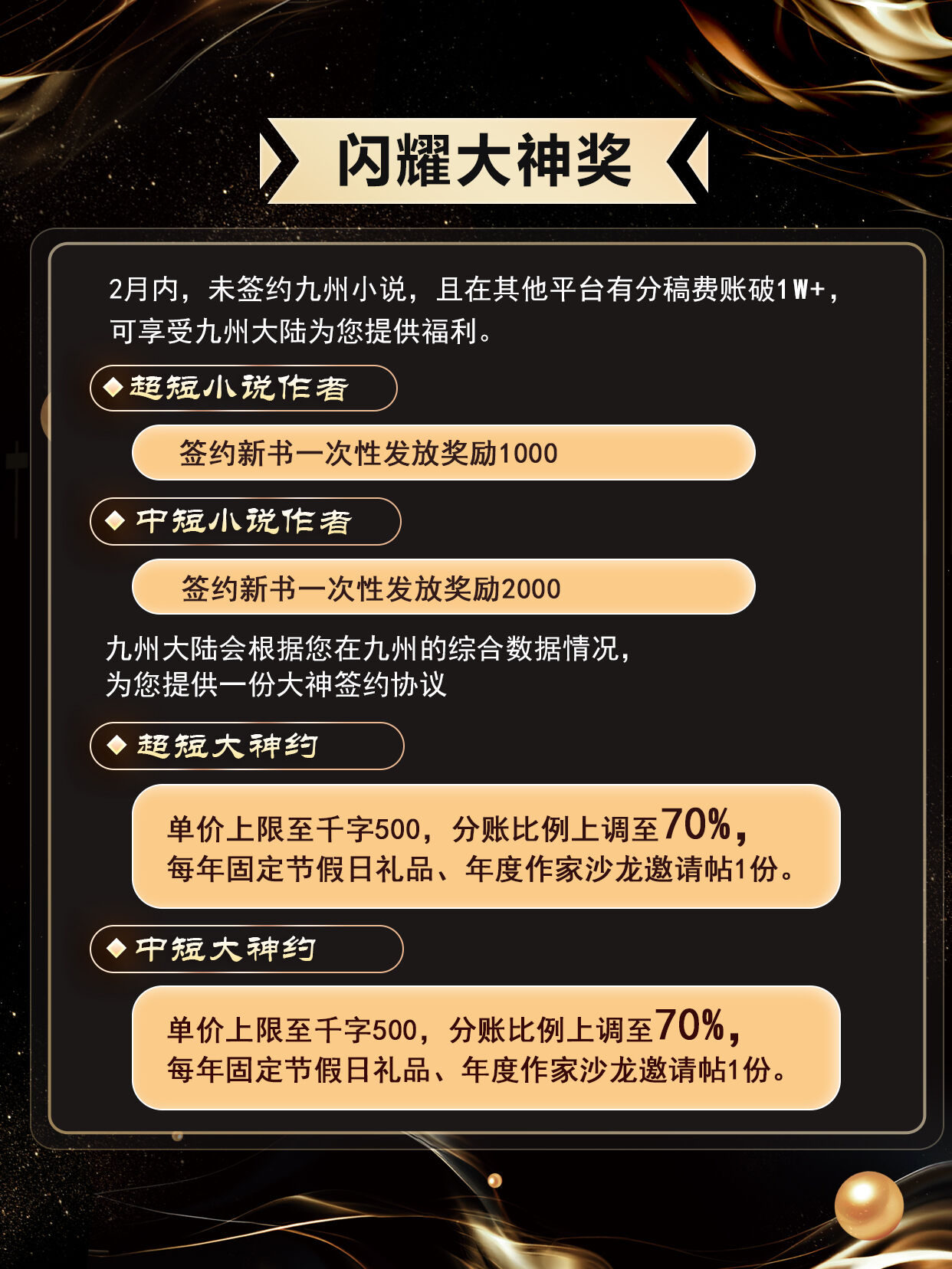 2月内,未签约九州小说,且在其他平台有分账稿费破1w+,可享受九州大陆为您提供福利