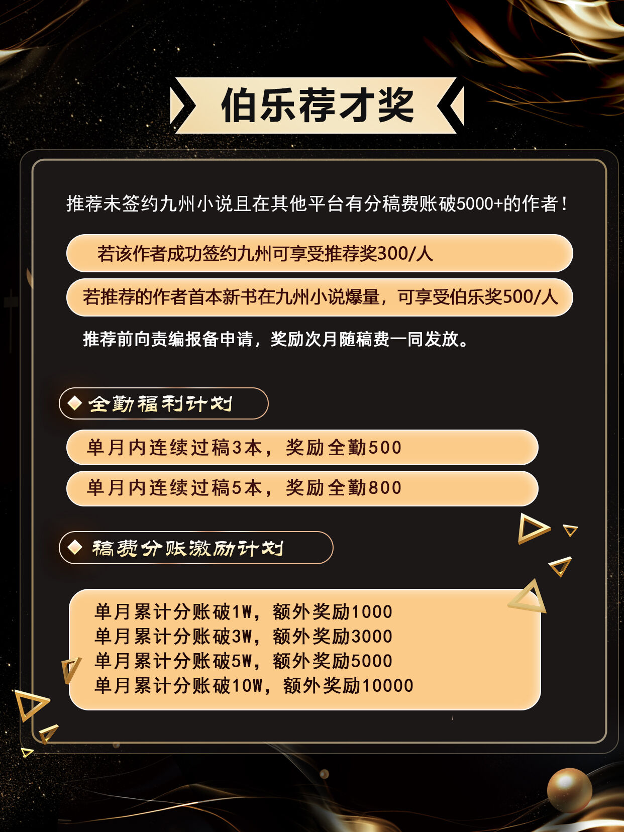 若推荐的作者首本新书在九州小说爆量,可享受伯乐奖500/人