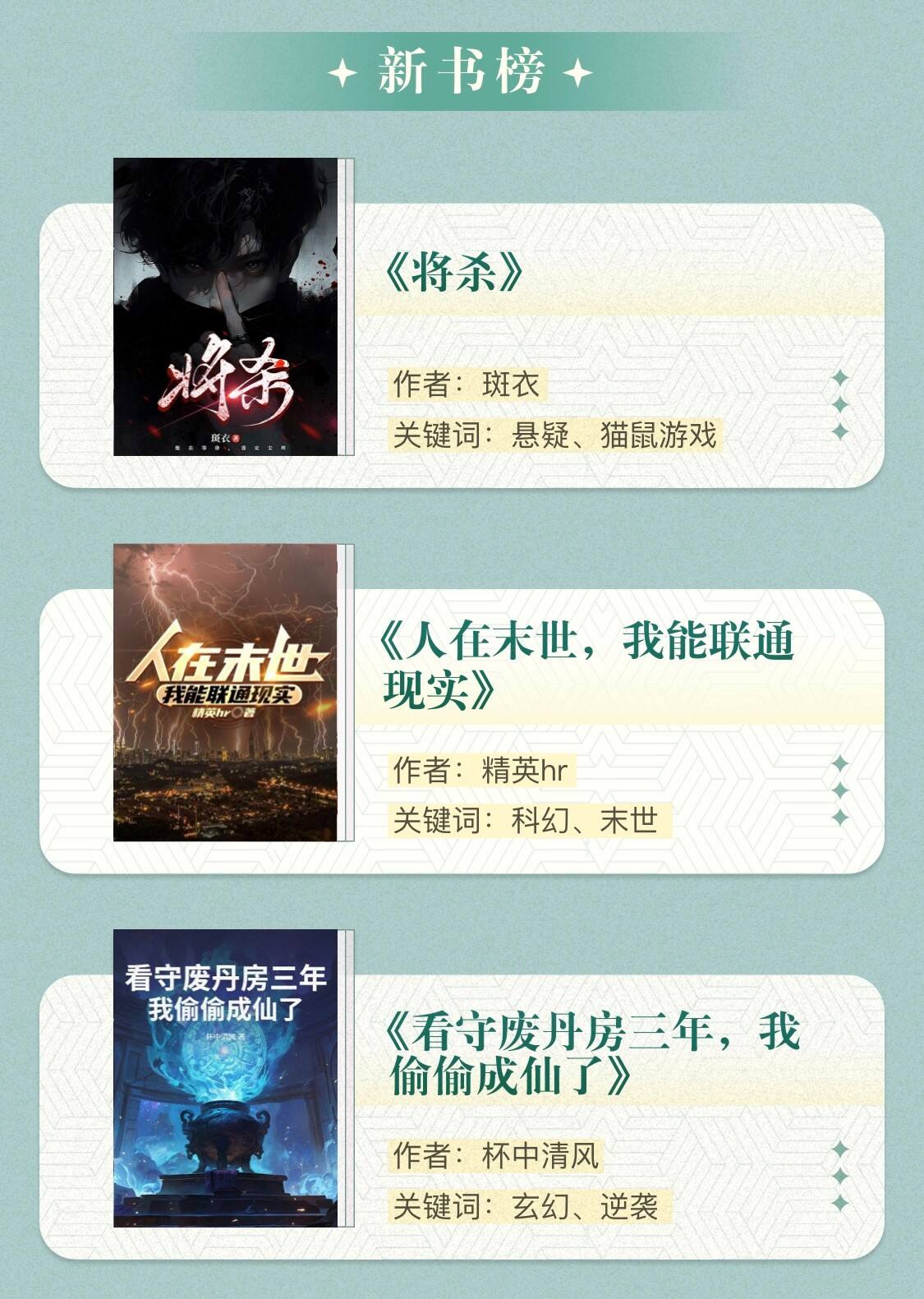 在新书榜中,三部新作使用了创新的叙事与结构。悬疑探案作品《将杀》设定主角患上“间歇性失忆症”形成“不可靠叙事”,引导读者在反转中重构对人物与案件的认知;《人在末世,我能联通现实》以独特的双时空设定突破传统末世题材的叙事窠臼,构建出跨越十余年时空的协作与互助框架;《看守废丹房三年,我偷偷成仙了》巧妙融合修仙元素与现代网文爽感逻辑,使故事呈现独特节奏和层次感。