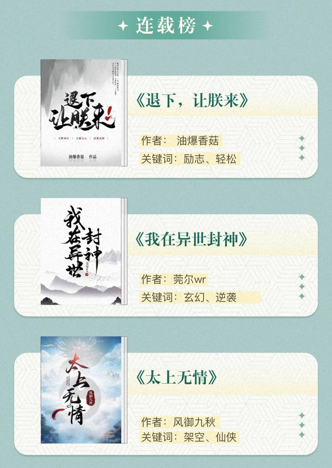 三部入选连载榜的作品,都在类型文框架下,融入现实或社会思考。《退下,让朕来》表面上是酣畅淋漓的争霸爽文,深层却通过沈棠的帝王之路传达了对基建理想、百姓安康与王国秩序的深层关怀;《我在异世封神》融合中式灵异传统、封神体系与政治寓言,以类型化的叙事策略回应生存伦理、命运结构与个体自主性等深层命题;修真主题的《太上无情》引入政治权谋、民族大义等现实维度,体现了“无情之道”与人性之间复杂的冲突与融合。
