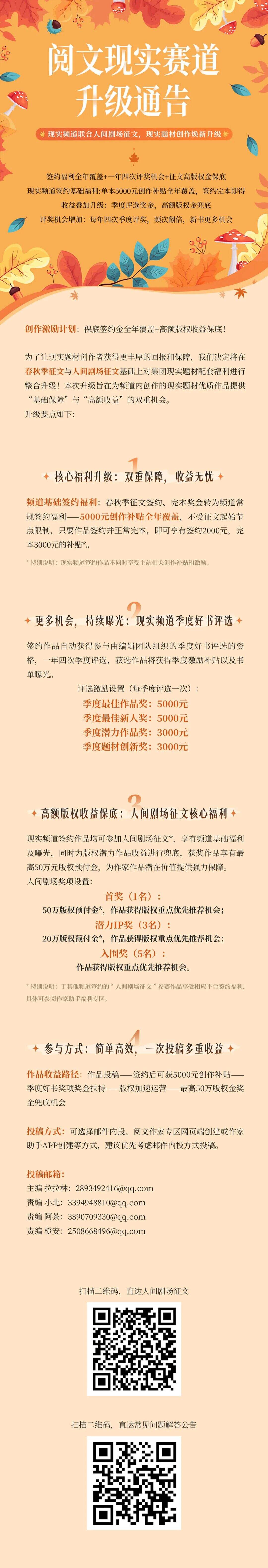 据悉,现实频道将联合人间剧场征文,助力现实题材创作焕新升级,整体而言就是,签约福利全年覆盖+一年四次评奖机会+征文高版权金保底。