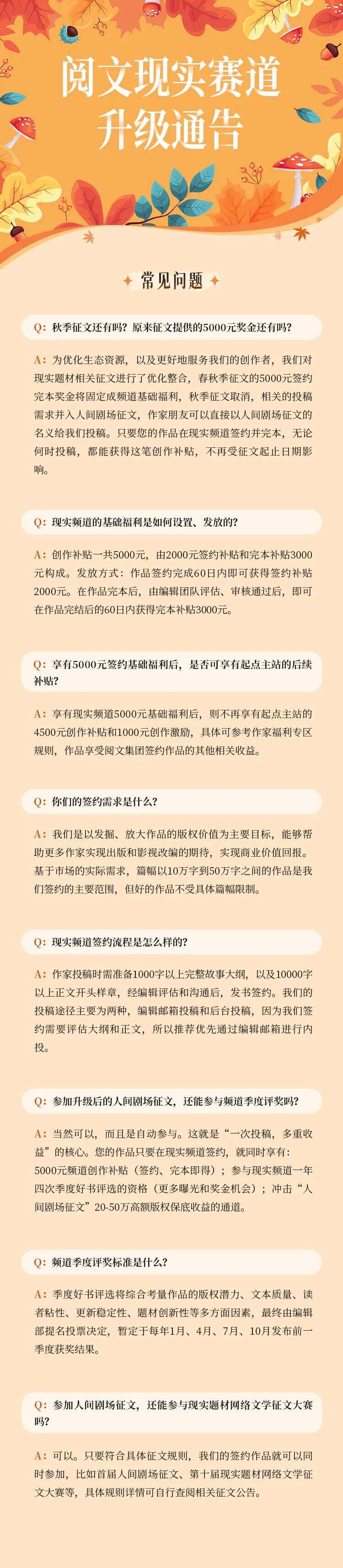 福利细节包含但不限于:现实频道签约基础福利:单本5000元创作补贴全年覆盖,签约完本即得。收益叠加升级:季度评选奖金,高额版权金兜底评奖机会增加:每年四次季度评奖,频次翻倍,新书更多机会!