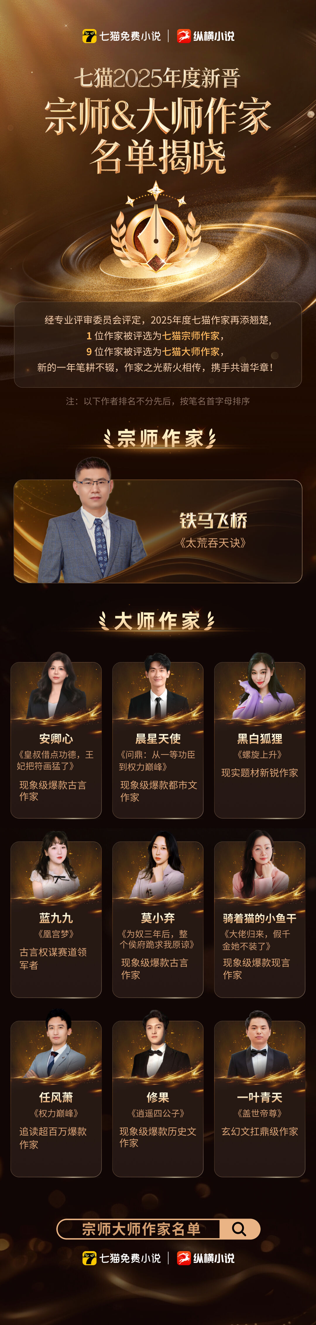 七猫2025年度新晋宗师、大师作家名单今日重磅揭晓!