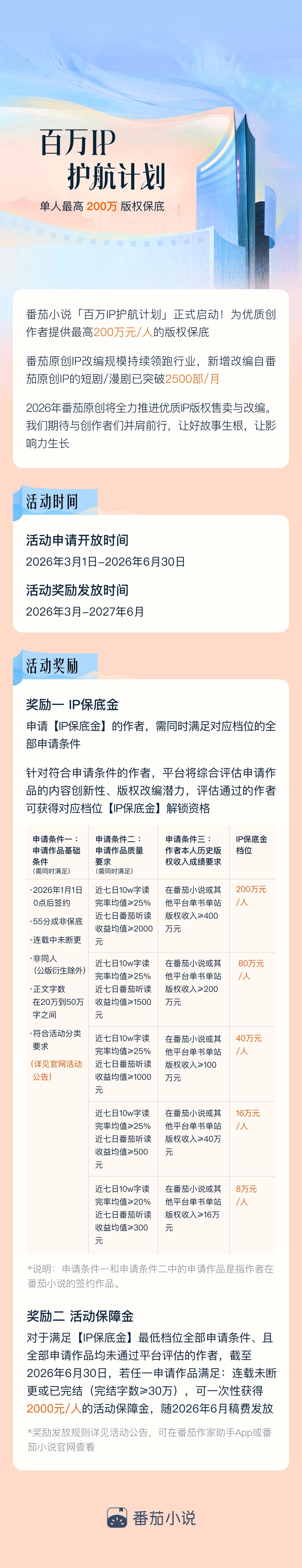 番茄小说「百万 IP 护航计划」正式启动!为优质创作者提供最高200万元/人的版权保底!番茄原创 IP 改编规模持续领跑行业,新增改编自番茄原创 IP 的短剧/漫剧已突破 2500 部/月!2026年番茄原创将全力推进优质 IP 版权售卖与改编,以坚实保障为创作者们保驾护航。我们期待与创作者们并肩前行,让好故事生根,让影响力生长!点击【百万IP护航计划】即可了解活动更多详情!