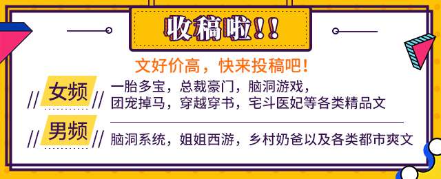 男频收稿方向:天降姐姐文,脑洞系统文,逃亡游戏文,乡村奶爸,都市赘婿以及各类飞卢风等爽文。
