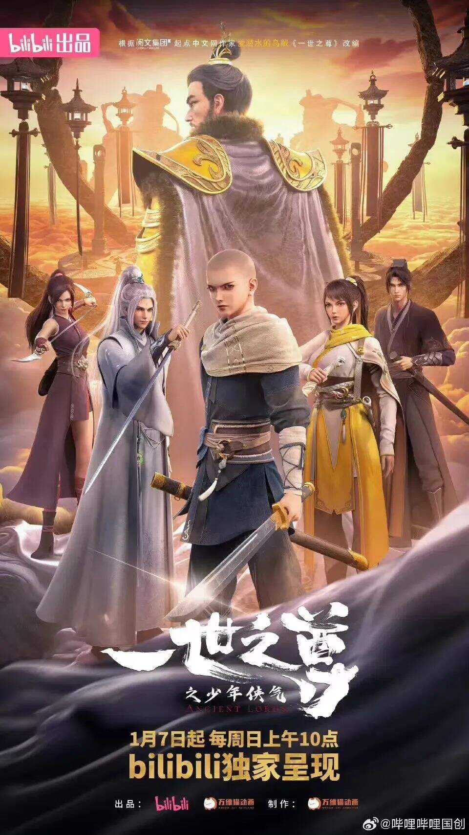 《一世之尊》定档1月7日,将在哔哩哔哩视频网站独家播出。《一世之尊》改编自爱潜水的乌贼创作的同名东方玄幻修真类小说,讲述异乡人孟奇身负不明身世,被送进少林,剃度出家,一场延绵千万年的阴谋,让孟奇莫名陷入了轮回游戏的故事。爱潜水的乌贼,知名网文作家,代表作品有《诡秘之主》《长夜余火》《宿命之环》等,其中,《宿命之环》曾入选网络文学青春榜月榜。